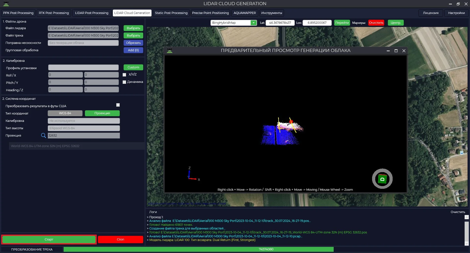 | Tools | Maps, point cloud viewer, projection calibration, RINEX file merging and other auxiliary functions. |